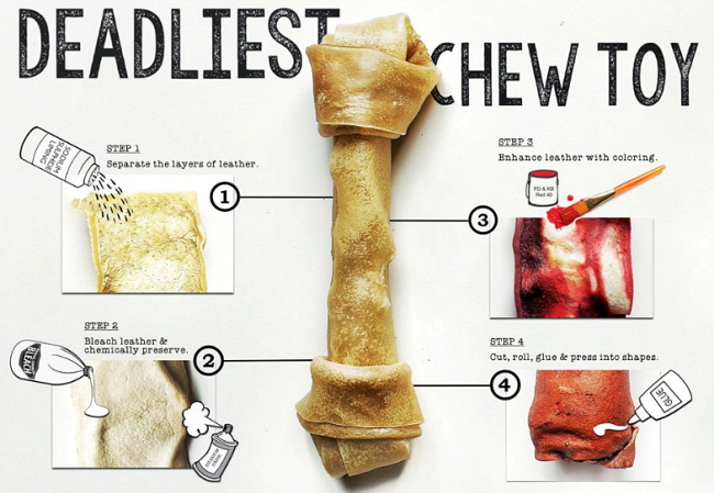 Since the FDA doesn’t consider these chews to be food, it’s a free for all when it comes to making these leather strips . . . and adding products to them so they'll last forever.